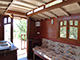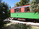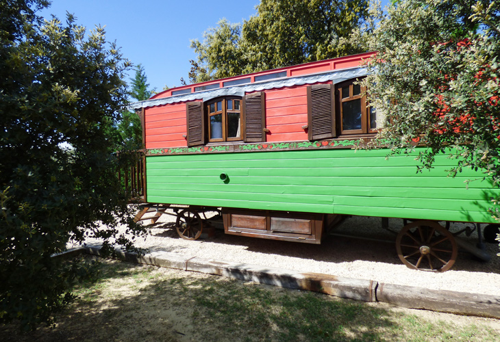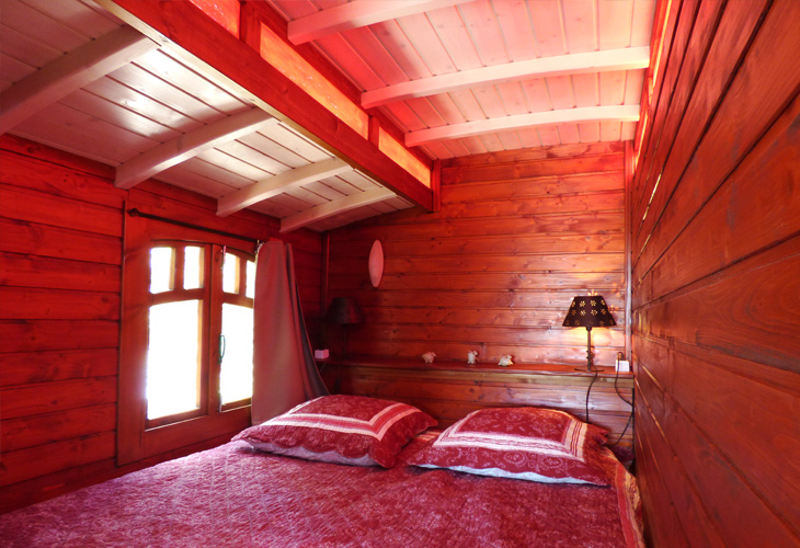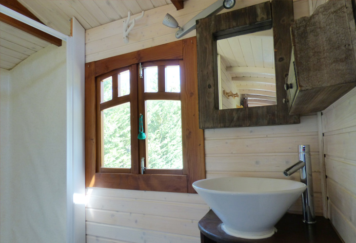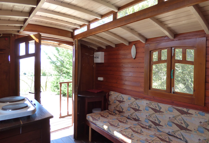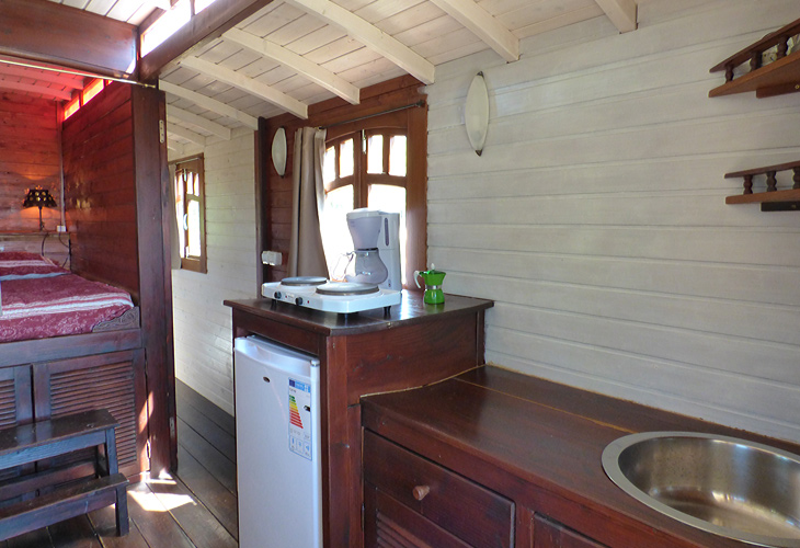 La roulotteĀ "Bellevue" est équipée d'un lit double de 140, d'une banquette d'une place, d'une petite salle de bain avec douche, lavabo et WC.